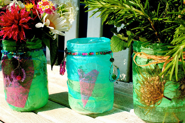 Sambata vom face asa: intai si inati, vine fiecare si cum are cu un borcan de sticla. Gol. Uscat si spalat. Mai apoi – de la MOMO citire, cu hartie colorata – creponata, dantelata, servetelata sau matasata :-)), taiata fasii vom lipi. Aducem si niste nasturasi si cu ce mai avem noi prin atelier – scoici, paiete, pietricele..snururi si altele, terminam de decorat. Lacuim bine sa nu ramanem fara frumusata de vaza si asteptam cu nerabdare sa punem in apa primul buchet pentru mama sau bunica…sau cine vrem noi. Cat sta vaza la uscat…noi ne punem pe pictat!!