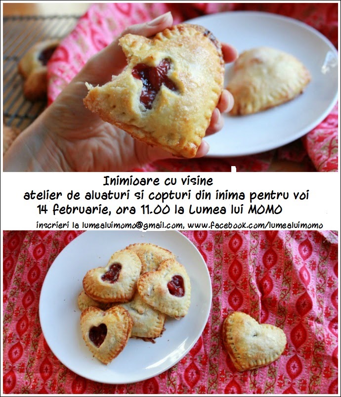 Oricând putem găsi un moment bun să ne bucurăm că suntem şi că iubim. Iar când putem împărţi ceea ce simţim şi cu cei dragi nouă, pofta de joacă şi imaginaţie, în ceea ce ne priveşte, este fără limite. Am aflat noi, că în bucătărie se deschid inimile, aşa că vă poftim să ne împrietenim, cocărind inimi dulci umplute cu vişine. Da, aţi auzit bine, vişine în luna lui februarie – păstrate bine la congelator – din luna lui cuptor. Si da, sunt fara zahar si unt.